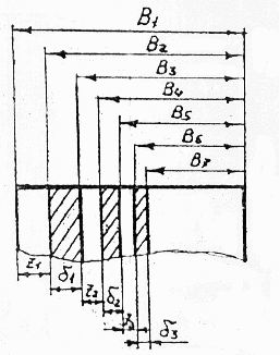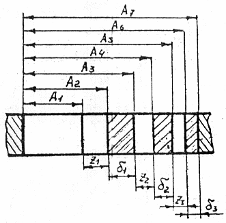 A2 и A3, A4 и A5, A6 и A7 - наименьшие и наибольшие предельные размеры отверстий после первой, второй и третьей операции соответственно. Имея в виду то, что B6 - это один из размеров детали, указанный в чертеже. Графическое построение поле припусков и допусков проводят в последовательности обратной последовательности обработки.