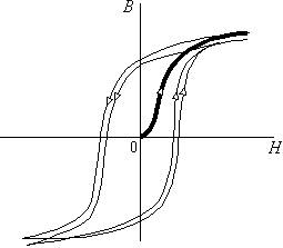 Если в процессе намагничивания довести напряженность поля до некоторого значения, а затем начать уменьшать, то уменьшение индукции будет происходить медленнее, чем при намагничивании и новая кривая будет отличаться от первоначальной. Кривая изменения индукции при увеличении напряженности поля для предварительно полностью размагниченного вещества называется начальной кривой намагничивания. На рисунке 1 она показана утолщенной линией. Основная кривая намагничивания имеет ряд характерных участков, которые можно условно выделить при намагничивании монокристалла ферромагнетика. Первый участок кривой намагничивания соответствует процессу смещения границ менее благоприятно ориентированных доменов. На втором участке происходит поворот векторов намагниченности доменов в направлении внешнего магнитного поля. Третий участок соответствует парапроцессу, т.е. завершающему этапу процесса намагничивания, когда сильное магнитное поле поворачивает в направлении своего действия не сориентированные магнитные моменты доменов ферромагнетика.