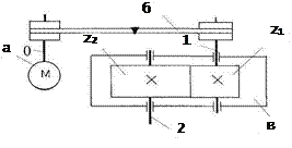 Рис.1.1 . Кинематическая схема привода: а – электродвигатель; б – клиноременная передача; в – редуктор цилиндрический одноступенчатый; 0 – вал электродвигателя; 1 и 2 – ведущий и ведомый (выходной) валы редуктора; z 1 и z 2 – числа зубьев колес Рис.1.1 |