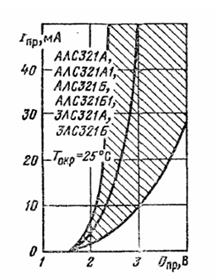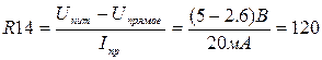 Номинал R14 выбираем таким образом, чтоб ток через светодиод не превосходил предельный постоянный ток через один сегмент - 25 мА. Зададим 20 мА и вычислим R19. По ВАХ светодиодов индикатора (рис. 3) находим падение напряжения на светодиодах при 20 мА.