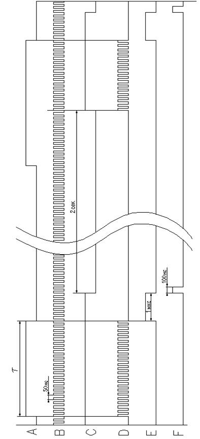 Предполагаем, что входные импульсы – стартовый и стоповый предаются по одному кабелю. Формирователь временного интервала – делитель на 2 формирует импульс длительности τ, который разрешает счет. По отрицательному фронту этого импульса формируется импульс на первом одновибраторе в системе сброса и периода индикации, который разрешает запись измерения временного интервала в память дешифратора, откуда это измерение отображается на индикаторе. Затем второй одновибратор системы сбрасывает счетчик, запускаясь по отрицательному фронту импульса первого одновибратора. Также по отрицательному фронту импульса первого одновибратора, запускается еще один одновибратор, функция которого – задержать выведенную информацию на 2 секунды, для того, чтобы успеть воспринять ее.