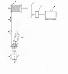 Кінематична схема підйомної лебідки крана приведена на рисунку 1.1, де 1 – канатний барабан, 2 – редуктор, 3 – муфта з електромагнітним фрикційним гальмом, 4 – привідний двигун, 5 – поліспаст, 6 – вантажозахоплюючий пристрій (крюк), 7 – корисний вантаж.