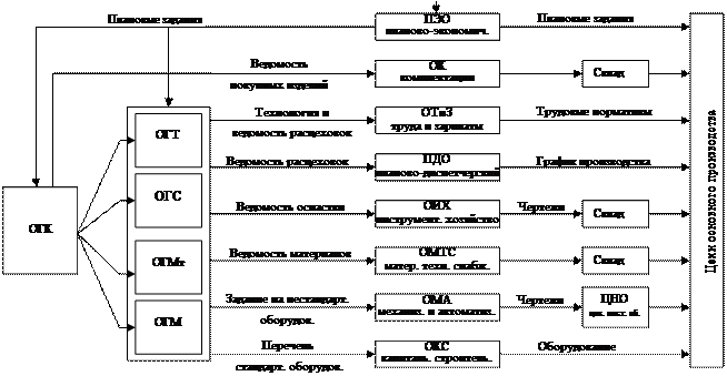В подготовке производства нового изделия принимают участие все службы предприятия. Рассмотрим порядок подготовки производства по принципиальной схеме управления предприятием, представленной на рис. 1.1. Новое изделие разрабатывается в отраслевом институте или отделе главного конструктора (ОГК). Получив чертежи и исходные данные, службы отделов главного технолога (ОГТ), главного механика (ОГМ), главного металлурга (ОГМт), главного сварщика (ОГС) разрабатывают технологические процессы и всю необходимую документацию.