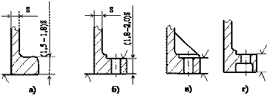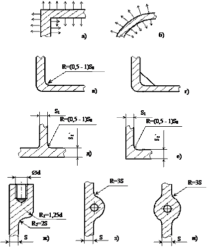 На рис. 2.2,д показаны рекомендуемые радиусы скруглений для Т-образных сочленений, а на рис. 2.2,е для соединения стенок с фланцами. Здесь S0 = 0,5 (S1 + S2 ).