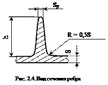 у верхушки и высота h. Для ребер с высотой 20 – 80 мм существует норма уклонов. Основание ребер соединяют со стенкой галтелями радиусом R, который равен половине размера стенки S. При охлаждении ребро затвердевает ранее всего массива детали, что ведет к появлению в нем напряжений сжатия, а они благоприятны для повышения прочности ребра и всей детали в целом. Внутренние ребра выполняют как ребра жесткости, а не ребра охлаждения. Поэтому они имеют малую высоту. Для целей охлаждения используются наружные ребра, высота которых обычно составляет (3 – 6)S. Более высокие ребра плохо отливаются. Толщину наружных ребер при вершине делают равной (0,6 – 0,7)S.