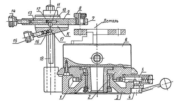 В два отверстия корпуса 3 запрессованы две параллельные направляющие втулки 18,по которым в вертикальном направлении перемещается ползун 10.Кондукторная планка 9 устанавливается на требуемый диаметр расположения осей отверстий по окружности вручную по нониусу, нанесенному на боковой прикрывающей планке и миллиметровой шкале на кондукторной планке. Кондукторная планка 9 после перестановки закрепляется винтом 14 с накатной головкой, который через промежуточный плунжер 13 и шарик 12 действует на зажимной шарик 11,который заклинивается в продольномV- образном пазу ползуна 16. В постоянную кондукторную втулку 7 устанавливается сменная кондукторная втулка 8. Регулируемый по высоте ползун 10 зажимается в требуемом положении винтом 15 с накатной головкой, действующим через шарик 16. Шарик 16 как клин передаёт давление на два промежуточных шарика 17, расположенных в поперечном канале ползуна 10, прижимающих плунжеры, расположенные в этом канале, к колонкам 18.