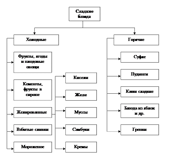 К холодным сладким блюдам относятся свежие фрукты и ягоды, компоты и фрукты в сиропе, желированные блюда (кисели, желе, муссы, самбуки, кремы), взбитые сливки, мороженое. К горячим – суфле, пудинги, каши сладкие, блюда из яблок, гренки и др.