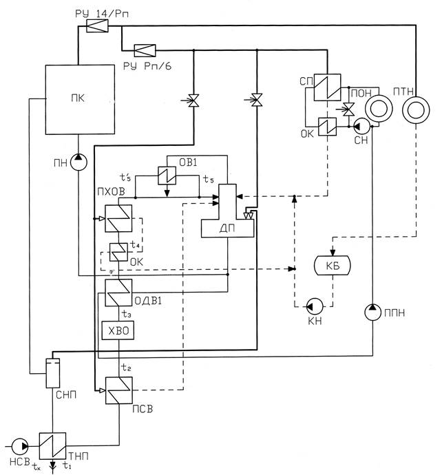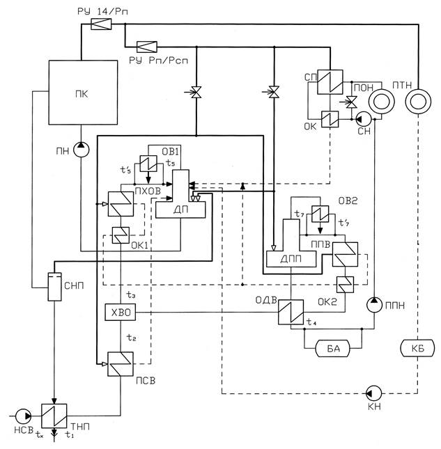 В схеме два деаэратора – питательный (ДП) и подпиточный (ДПП) - в комплекте с пароводяными подогревателями, необходимыми для подогрева сырой (ПСВ) и химочищенной воды (ПХОВ) перед ДП до 80…90 °С. Перед ДПП химочищенная вода подогревается до той же температуры (80…90 °С) в пароводяном подогревателе подпиточной воды (ППВ).