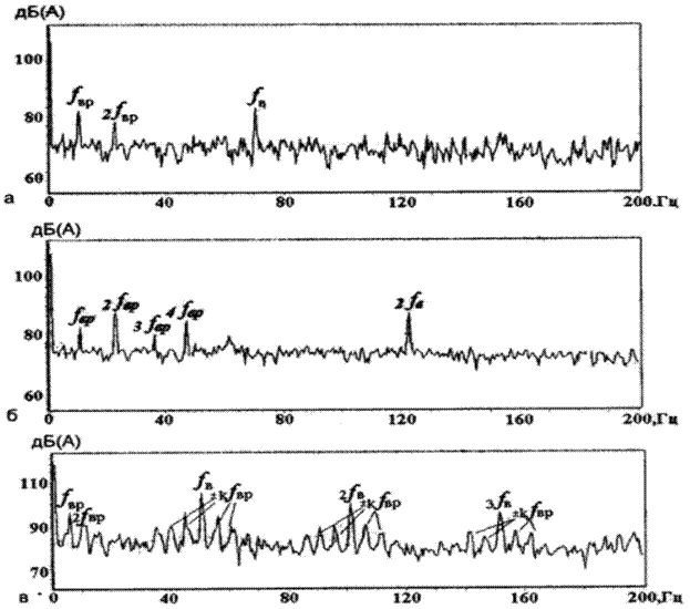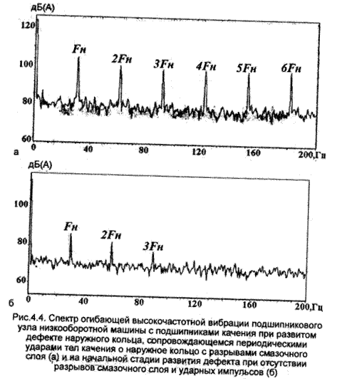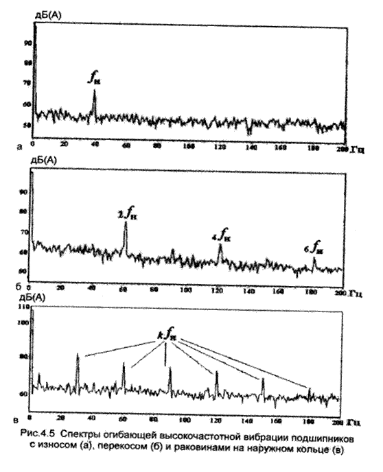 Основной вклад в низкочастотную вибрацию роторных машин с подшипниками качения обычно вносят составляющие вибрации на частотах, кратных частоте вращения ротора, которые чаще всего не определяются «и свойствами подшипников, ни их состоянием, а связаны с качеством центровки машин, балансировки роторов и техническим состоянием соединительных муфт. Но если анализировать спектр низкочастотной вибрации машины, то в нем обычно присутствует большое число менее сильных составляющих, определяемых качеством изготовления и монтажа подшипников, а также развитыми дефектами подшипников, возникающими вовремя эксплуатации машины.