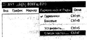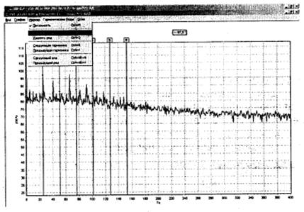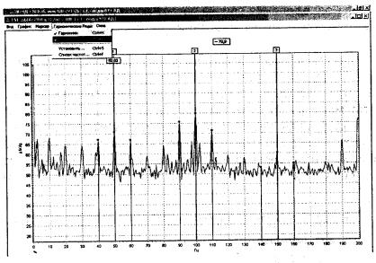 - в центральной части показаны частоты наиболее сильных гармонических составляющих, при выборе спектральной составляющей она отображается на спектре;