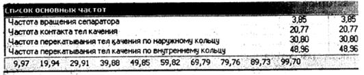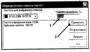 - в верхней левой части (над списком частот) - значение частоты (1), и если эта частота совпадает с какой-нибудь расчетной частотой механизма, то обозначение, с какой именно частотой совпадает (2);
