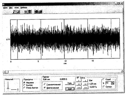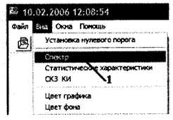 - увеличение части спектра, для этого, удерживая левую кнопку мыши, надо движением вниз-вправо выделить нужный фрагмент спектра (щелкнув на спектре и удерживая правую кнопку мыши, можно передвигать спектр), чтобы вернуться к отображению полного спектра, нажав левую кнопку мыши, проведите вверх-влево;