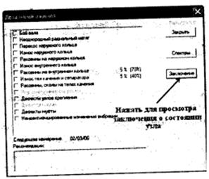 37.-В окне детального анализа (рис.42) представлен список возможных дефектов для данного типа оборудования, выделены те дефекты, которые были обнаружены в результате автоматической диагностики, указаны степень развития дефекта и вероятность его наличия. Для просмотра заключения о состоянии узла, рекомендаций и диагностических признаков, по которым поставлен диагноз, нажмите кнопку Заключение.