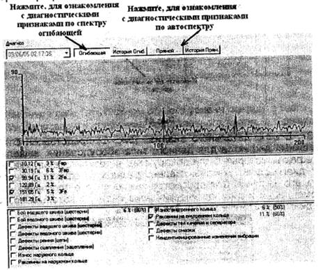 - в нижней правой части представлен список дефектов, которые присутствуют в узле и степень развития дефекта. Выбрав обнаруженный дефект, можно просмотреть те диагностические признаки, по которым программа поставила диагноз. Расшифровка некоторых диагностических признаков: