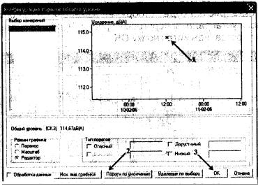Автоматическая установка порогов возможна только после накопления трех и более замеров или при установке порогов в точке, входящей в группу однотипного оборудования, для установки порогов нажмите кнопку "Пороги по умолчанию (2) (после чего значения порогов, будут отображены в окне). Чтобы принять уровни порогов, нажмите кнопку ОК (3).