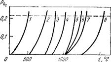 По приведенным температурным зависимостям можно установить области температур и давлений кислорода, для которых характерно существование тех или иных конденсированных фаз. Так, в области I парциальное давление кислорода