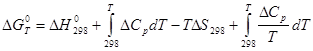 — алгебраическая сумма теплоемкостей, стандартные значения энтальпии и энтропии веществ, участвующих в реакции.