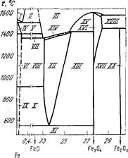 содержит несколько фаз постоянного и переменного составов. Однофазные области конденсированных фаз IX, VI, IVявляются ненасыщенными твердыми растворами кислорода в