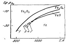 железа. Штриховые линии характеризуют формальную зависимость упругости диссоциации при изменении за пределами температурных пределов устойчивости оксида железа (