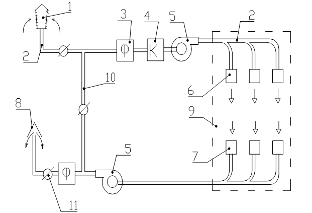 Установка приточно-вытяжной вентиляции состоит из следующих элементов в соответствии с рисунком 14: воздухозаборного устройства (воздухоприёмника) 1 для забора чистого воздуха; воздуховодов 2, по которым воздух подается в помещение; фильтров 3 для очистки воздуха от пыли; калориферов 4, где воздух нагревается; вентилятора 5; приточных отверстий или насадок 6, через которые воздух попадает в помещение (цех) 9; вытяжных отверстий или насадок 7, через которые воздух удаляется из помещения; устройства для выброса воздуха (вытяжная шахта) 8, расположенного на 1,0-1,5 м выше конька крыши; регулирующих клапанов 10. Фильтр, калориферы и вентилятор обычно устанавливают в одном помещении, в так называемой вентиляционной камере.