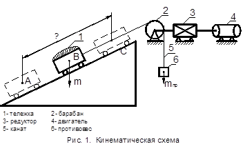 На рис. 1 приведена кинематическая схема механизма наклонного подъемника, электропривод которого надлежит разработать.