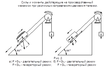 Перемещение тележки осуществляется при помощи троса 5, наматываемого на барабан 2, который сочленяется через редуктор 3 с двигателем 4. Для улучшения режима работы двигателя к барабану через трос 5 присоединяется противовес 6. При остановках в нижнем и в верхнем положениях тележка удерживается с помощью электромагнитных тормозов. В общем случае предлагается, что при пуске двигателя его растормаживание происходит мгновенно в момент времени, когда электромагнитный момент двигателя Мg сравняется со статическим моментом Мс.