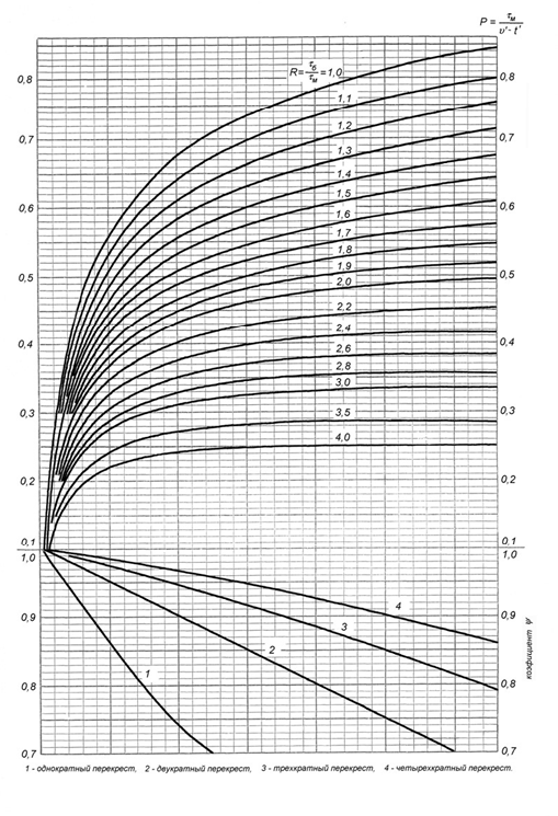 Предварительно вычисляются две разности температур: для дымовых газов υ′−υ′′ и для воды t ′′− t ′. Большая из этих разностей – это τ б , меньшая обозначена как τ м . Далее вычисляются величины P и R , равные соответственно