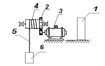1- электродвигатель; 2-редуктор; 3- грузозахватное устройства; 4-барабан; 5-канат;