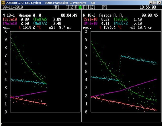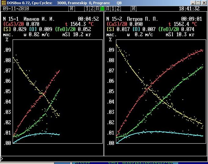 Изображение, генерируемое имитационной программой, представлено на рис 8 (правая панель). В верхней части панели приводятся выборочные числовые значения измеряемых величин, на графике отображены все значения, полученные в ходе моделирования процесса. В обозначениях компонентов металлического и шлакового расплавов использованы принятые литервтуре металлургической тематики дополнительные знаки. Квадратные скобки обозначают принадлежность компонента металлическому расплаву, а круглые – шлаковому. Множители при обозначениях компонентов используются только для построения графика, их не следует учитывать при интерпретации значений. Во время работы модели в каждый данный момент отображается только значение одной из измеряемых величин. Через 6 сек оно исчезает и появляется значение следующей величины. За этот промежуток времени надо успеть записать очередное значение. Для экономии времени рекомендуется неизменные цифры не записывать, например, ведущую единицу в значении температуры.