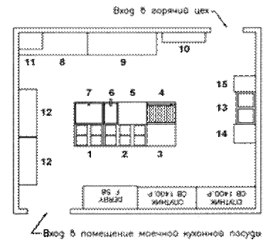 14) состав производственных помещений (горячий цех, холодный цех, цех полуфабрикатов, кондитерский цех, мучной цех, моечные помещения);