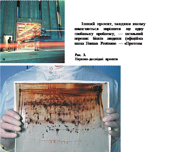 людини»). Завдання, що лежить в основі проекту, — це створення принципово нових засобів лікування та діагностики хвороб. Цей проект цікавий тим, що він реалізується в лабораторіях практично всіх країн світу. Ідея полягає в тому, щоб скласти списки всіх білків людського організму. крім того, необхідно не лише з’ясувати, з яких амінокислот складається білок, а й які функції він виконує. Ось тут і криється «ключ» до створення, як вважають дослідники, принципово нової медицини, яка надзвичайно швидко і якісно діагностуватиме будь-яку хворобу та максимально ефективно її виліковуватиме. скоординувати наукові групи, що працюють над цією проблемою, намагається міжнародна Організація протеому людини — Human Proteome Organization (HUPO). Особливий акцент вони роблять на білках головного мозку, крові та печінки (рис. 3, б ).