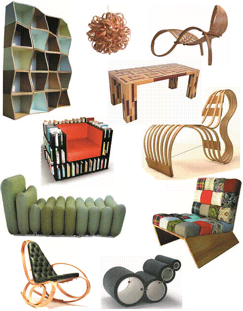 а ось інший приклад, коли дизайнери Німеччини (дизайнерська фірма «ZweitSinn») долучаються до участі у вирішенні проблем екології через виготовлення меблів. Щорічно в Німеччині викидають близько 7 тонн використаних меблів. Працівники фірми вирішили, що вторинна сировина — це недорогий матеріал і водночас екологічно безпечне виробництво. адже відомо, що під час виготовлення кожного кілограма дощок в атмосферу потрапляє понад 350 грамів сО2 , інакше кажучи, виготовлення меблів «ZweitSinn» стоїть на заваді викидам вуглекислого газу в повітря. у своєму каталозі фірма вказує у кожній позиції, від якої кількості грамів сО2 вбереже землю використання цієї продукції із вторинної сировини. Наприклад, крісло «Pixelstar» — 11 кг, модуль-полиці «Frank» — 2 кг, ліжко «Horizont» — 158 кг тощо (рис. 4).