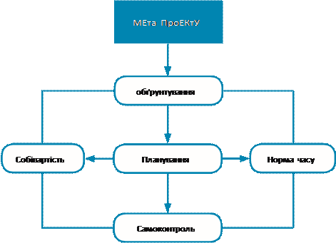 Здійснювати таку організацію починають з мети проекту й безпосереднього обґрунтування власне проблеми чи ідеї, яку реалізують у майбутньому. Обґрунтування здійснюють на основі собівартості проекту та витрат часу для виконання відповідних робіт. Якщо ці показники є високими у фінансовому еквіваленті (проект занадто дорогий), то повертаються до мети і завдань, щоб переглянути ідею чи творчий задум. Зв’язок між метою й основними параметрами проекту показано на рис. 5.