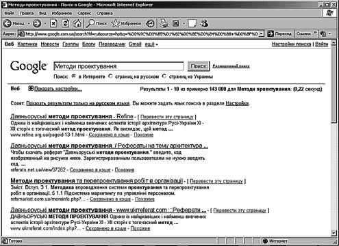 Як свідчить практика, пошукові системи дають змогу здійснити найповніший пошук у межах заданої теми. робота пошукової системи налічує три етапи. На першому етапі сканується інформаційний простір і збираються копії веб-ресурсів. На другому етапі бази даних, складені за результатами сканування, систематизуються так, щоб у них можна було здійснювати прискорений пошук. а на третьому етапі пошукова система приймає запит від користувача і після цього здійснює пошук у своїх базах та відображає веб-сторінку з оформленими результатами пошуку: