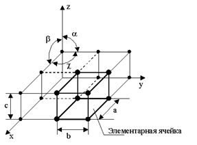 Элементарная ячейка характеризует особенности строения кристалла. Основными параметрами кристалла являются: размеры рёбер элементарной ячейки- a, b, c , периоды решётки-расстояния между центрами ближайших атомов в одном направлении выдерживаются строго определённые углы между осями (