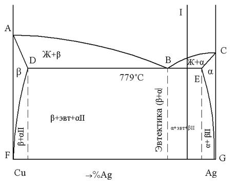 В заэвтектических сплавах. Максимальное содержание компонента Cu в фазе α определяется точкой Е и при охлаждении снижается до точки G . Поэтому при охлаждении от точки E до G точки, происходит выделение компонента Cu виде вторичных кристаллов β-фазы, богатой компонентом В. Конечная структура сплава будет α+βII. В эвтектическом сплаве в точке Ж превратится в эвтектику Ж