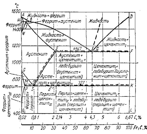 Равновесное состояние железоуглеродистых сплавов в зависимости от содержания углерода и температуры описывает диаграмма состояния железо - углерод. На диаграмме состояния железоуглеродистых сплавов, на оси ординат отложена температура, на оси абсцисс - содержание в сплавах углерода до 6,67%, то есть до такого количества, при котором образуется цементит Fе3С. По диаграмме состояния системы железо - углерод судят о структуре медленно охлажденных сплавов, а также о возможности изменения их микроструктуры в результате термической обработки, определяющей эксплуатационные свойства. На диаграмме состояния Fe - С приняты международные обозначения. Сплошными линиями показана диаграмма состояния железо - цементит (метастабильная, так как возможен распад цементита). Рассматриваемую диаграмму правильнее считать не железоуглеродистой (Fe - С), а железоцементитной (Fe - Fе3С), так как свободного углерода в сплавах не содержится. Но так как содержание углерода пропорционально содержанию цементита, то практически удобнее все изменения структуры сплавов связывать с различным содержанием углерода.