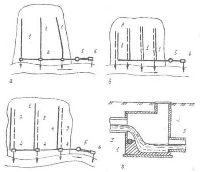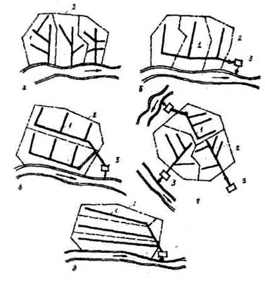 а) перпендикулярна; б) перехоплююча; в) паралельна; г) радіальна; д) зонна: 1 – колектори басейнів каналізування; 2 – межі басейнів каналізування; 3 – очисні споруди