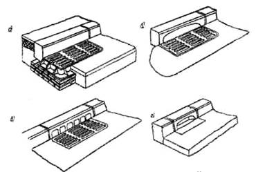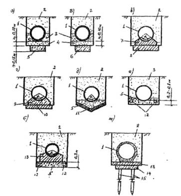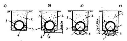 а ґрунтова плоска; б – фунтова плоска з піщаною підготовкою; в – ґрунтова і профільована; г – ґрунтова спрофільована; 1 – трубопровід; 2 – засипання траншеї; 3 – кігипання з підвищеним ступенем ущільнення; 4 – плоска; 5 – піщана подушка; П спрофільована основа.