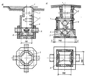 Колодязі на напірних трубопроводах встановлюють при необхідності розміщення в них засувок, випусків, вантузів та іншої арматури. Оглядові колодязі виконують з цегли або залізобетону. В плані вони можуть мати круглу або прямокутну форму (мал. 6).
