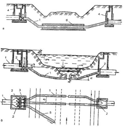 а – під транспортними магістралями; б – під водною перешкодою: 1 – трубопровід; 2 – шибер; 3 – засувка; 4 – колодязь; 5 – аварійний випуск; 6 – кожух