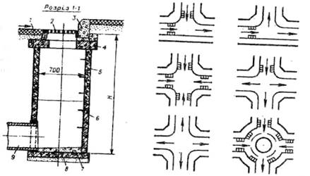 а – конструкція із збірного залізобетону; б – схеми розташування на перехрестях вулиць; 1 – дорожнє покриття; 2 – решітка; 3 – бортовий камінь; 4 плита перекриття; 5 – стінові кільця; 6 – ходові скоби; 7 – бетон; 8 – з'єднувальний трубопровід