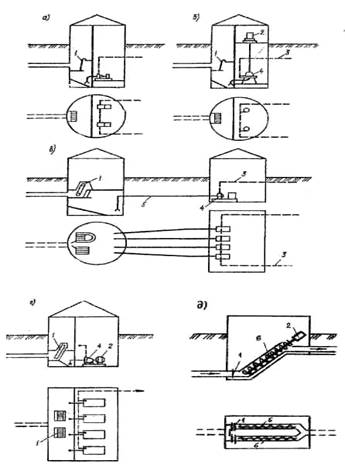 а, б – шахтного типу відповідно з горизонтальними та вертикальними насосами; в-з окремо розташованим приймальним резервуаром; г – прямокутна в плані; д – з шнековими насосами: 1 – решітка; 2 – електродвигун; З – напірний трубопровід; 4 – насос; 5 – всмоктувальний трубопровід; 6 – шнековий підйомник