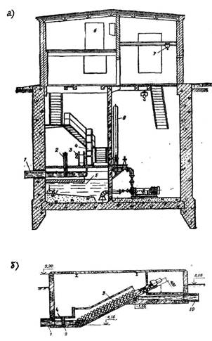 а) шахтного типу з горизонтальними фекальними насосами; б) із шнековими насосами: 1 – подвійний трубопровід; 2 – щитовий затвор; 3 – молоткова дробарка; 4 – решітки; 5 – приймальний резервуар; 6 – щит управління; 7 – кран-балка; 8 – напірний трубопровід; 9 – шнековий підйомник; 10 – вихідний трубопровід