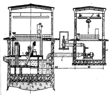 1 – решітки; 2 – приймальний резервуар; 3 – всмоктувальні труби; 4 – напірні труби; 5 – кран-балка; 6 – машинне відділення