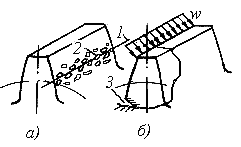 Разрушение начинается вблизи полюсной линии 1 (рис. 3, а), где имеют место наибольшие нагрузка Fn (зона однопарного зацепления) и сила трения Ff. Поверхность зуба покрывается «раковинами», «оспинами» 2. Глубина раковин около 0,2 мм. В мягких передачах (Н0 < 350 НВ) в результате приработки наблюдается ограниченное (начальное) выкрашивание. В твердых передачах (Н0 > 350 НВ) – выкрашивание прогрессирующее.
