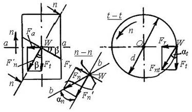 По линии зацепления b – b (рис. 5) действует нормальная сила Fn. Для удобства расчетов силу Fn принято раскладывать на три составляющие: