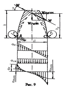 Кроме того, относительно заделки ножки зуба сила Fn действует на некотором плече, что вызывает изгибающий момент в основании зуба.