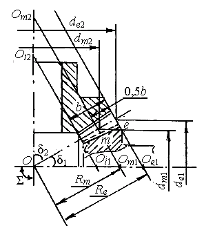 если смотреть с вершины делительного конуса О, то при совпадении вращения и наклона зубьев – верхние знаки, при отсутствии совпадения – нижние.