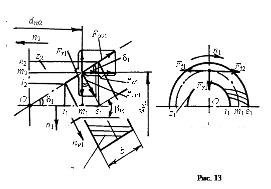 во избежание заклинивания зубьев при значительных зазорах в подшипниках необходимо обеспечить направление осевой силы Fа1 от вершины к внешнему торцу е1, т.е. сила Fа1 должна быть положительной. Это возможно при совпадении вращения и наклона зубьев.
